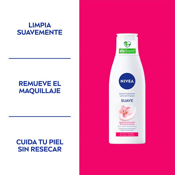 NIVEA Leche Limpiadora Suave está enriquecida con Aceite de Almendras y Hydramine, conocido por retener la hidratación en la piel. Desarrollada especialmente para piel seca y sensible, limpia suavemente y elimina el maquillaje (incluso el waterproof). Al mismo tiempo, la Leche Limpiadora Suave hidrata intensamente, suaviza y cuida de tu piel. ¿Resultado? La piel del rostro se limpia suavemente, consiguiendo un aspecto sano y bonito. Compatibilidad con la piel y los ojos dermatológicamente y oftalmológicamente comprobada.