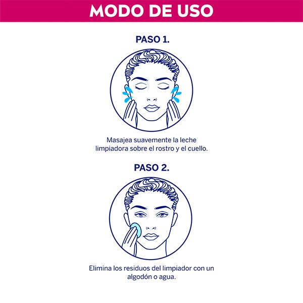 Aplica la leche limpiadora con la yema de los desdos o con un algodón, mediante un suave masaje circular ascendente, después reita aclarando abundantemente con agua.