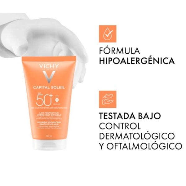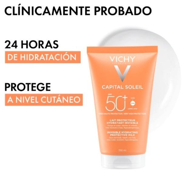 Leche Protectora Hidratante de Vichy, uno de los protectores solares con más alta cobertura dentro de la gama Capital Soleil. Diseñada específicamente para pieles sensibles, esta leche solar combina una defensa extrema contra los rayos UV con una textura ligera que no deja residuos.