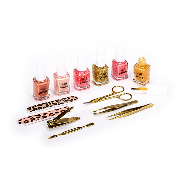 Set completo de manicura con esmaltes y herramientas para resultados profesionales.