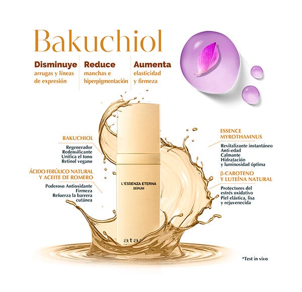 L'Essenza Eterna, el sérum antiedad global que resucita tu piel y calma tu mente con bakuchiol y ácido ferúlico 100% puros de origen natural.