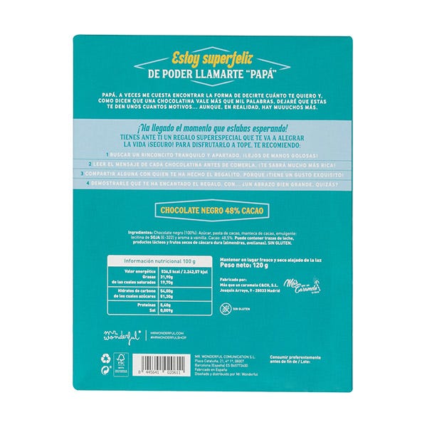 Caja con forma de librito, con 20 chocolatinas de chocolate negro en su interior y con mensaje dirigido a padres.