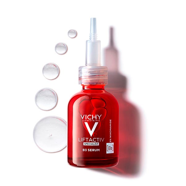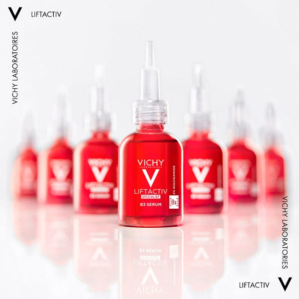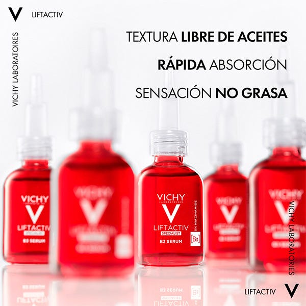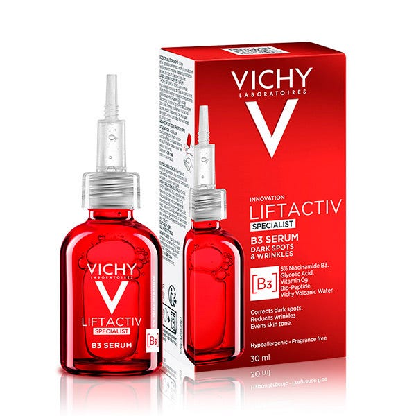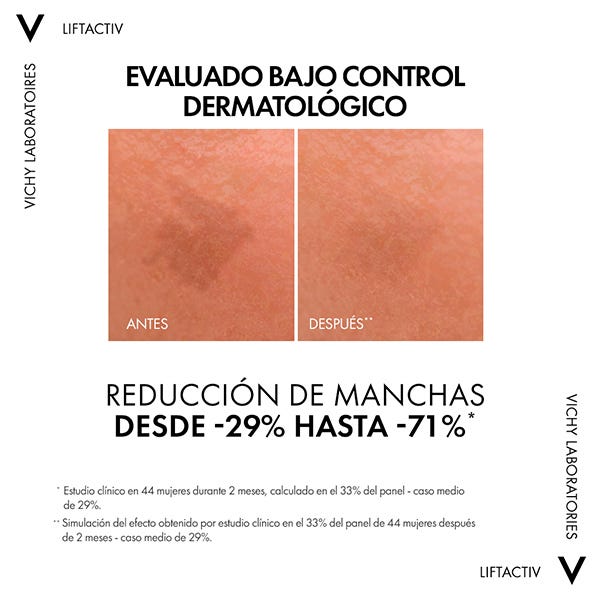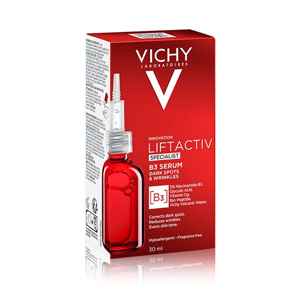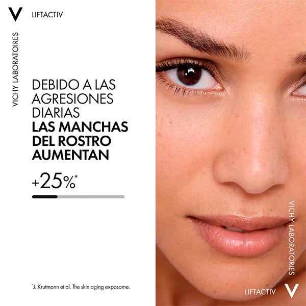 LIFTACTIV SÉRUM B3 ANTIMANCHAS de Vichy reduce visiblemente la apariencia de manchas y arrugas. La tez se ve más uniforme y radiante. Las manchas aumentan un 25%* debido a las agresiones diarias que sufre la piel.