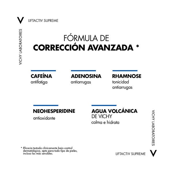 Con 5% de Rhamnose que aportan tonicidad y alisa las arrugas, 0,2% de Neohesperidine que contribuyen para la acción antioxidante de la piel, y agua volcánica de Vichy de origen volcánica, con propiedades calmantes e hidratantes para fortalecer la barrera cutánea.