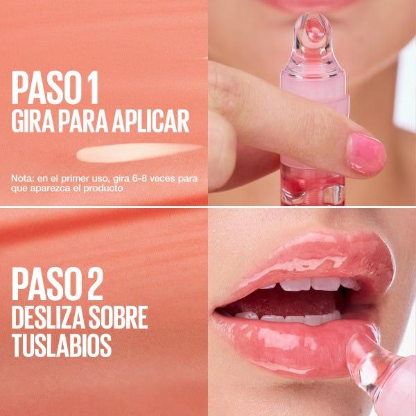 Girar el cuello del aplicador hasta liberar producto (6–8 clics la primera vez), aplicar directamente sobre los labios con la punta ergonómica.