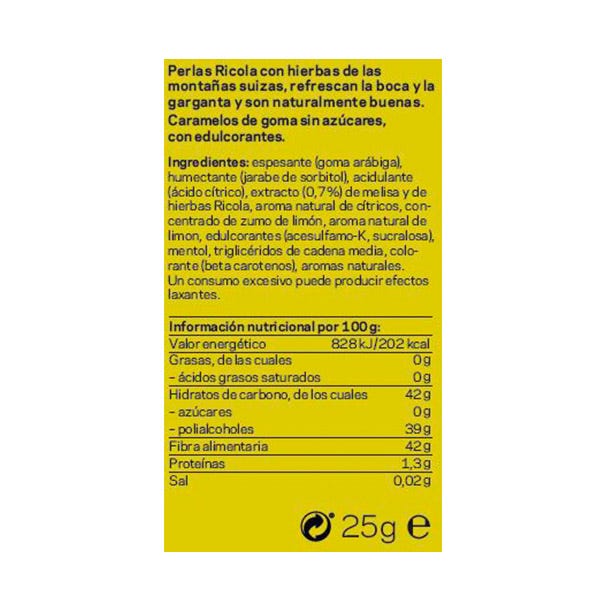 Espesante (goma arábiga), humectante (jarabe de sorbitol), acidulante (ácido cítrico), extracto (0,7%) de melisa y de hierbas Ricola, aroma natural de cítricos, concentrado de zumo de limón, aroma natural de limón, edulcorantes (acesulfamo-K, sucralosa), mentol, triglicéridos de cadena media, colorante (betacarotenos), aromas naturales.