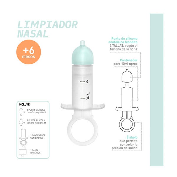 Limpiador nasal para bebés a partir de 6 meses que elimina suavemente el exceso de mucosidad, manteniendo las fosas nasales del bebé o niño húmedas y despejadas.