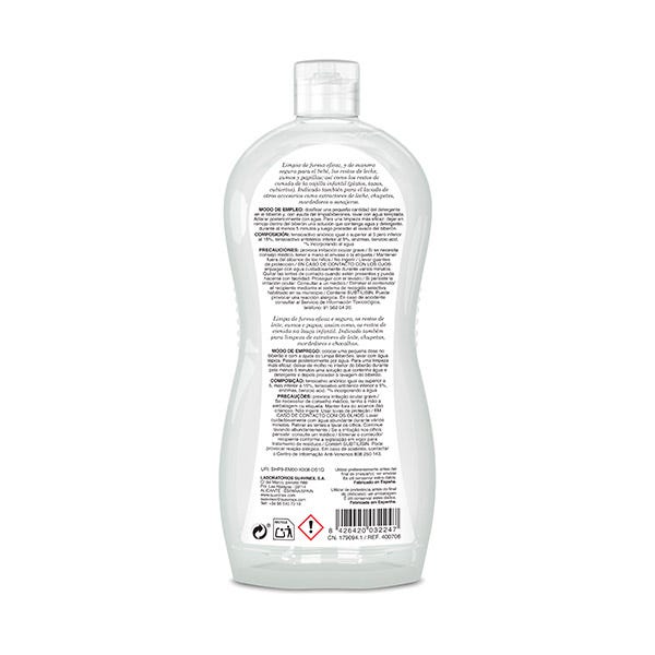Modo de empleo: Dosificar una pequeña cantidad del detergente en el biberón y, con ayuda del limpia biberones, lavar con agua templada.