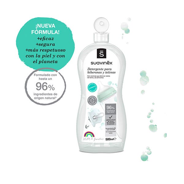 Detergente específico para biberones y tetinas Suavinex limpia de manera eficaz y segura los restos de leche, zumos y papillas; así como los restos de comida de la vajilla infantil.
