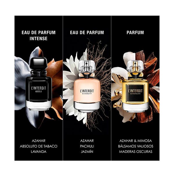 L'Interdit Parfum revela un aroma floral amaderado y balsámico sensual. Con la infusión de la suavidad de la esencia de almendra amarga, el icónico bouquet blanco de L'Interdit compuesto de flor de azahar, nardo y jazmín, se mezcla con las notas florales y aterciopeladas del absoluto de mimosa. La mezcla exclusiva de vetiver y pachulí revela el rastro balsámico más elegante y cautivador.