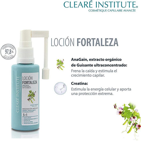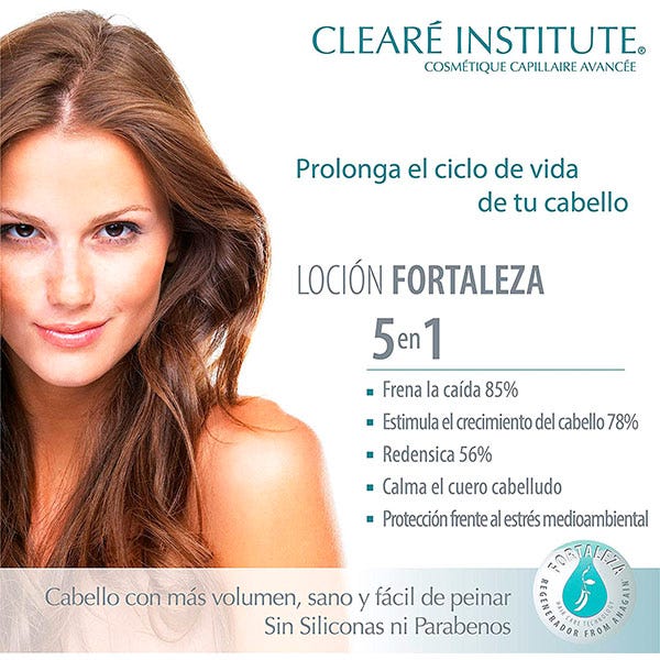La loción fortaleza de Clearé Institute, con ingredientes naturales y ecológicos frena la caída del cabello a la vez que estimula su crecimiento y fortaleza. Indicado para mujeres y hombres con problemas de caída.