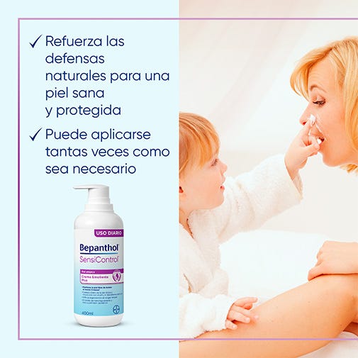 Bepanthol® SensiControl Crema Emoliente cuida a diario de la piel sensible y con tendencia atópica manteniéndola libre de brotes durante al menos 3 meses (1) favoreciendo el descanso nocturno de los niños. Proporciona una hidratación profunda y duradera para fortalecer la barrera cutánea y refuerza las defensas naturales para que la piel sensible con tendencia atópica se mantenga sana y protegida.