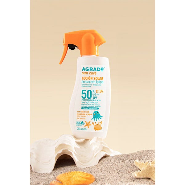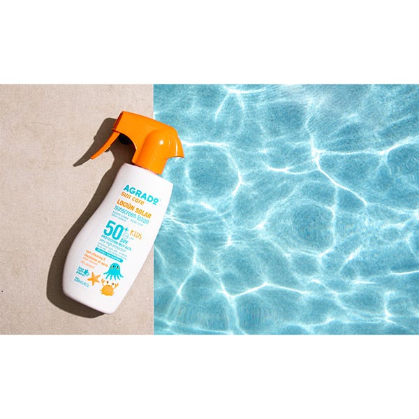 Loción solar kids pieles sensibles con protección SPF50+ que protege frente a los rayos UVA, UVB y contra infrarrojos.