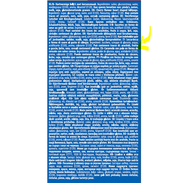ES- Caramelo con palo en forma de corazón con sabor cereza. Ingredientes: azúcar,