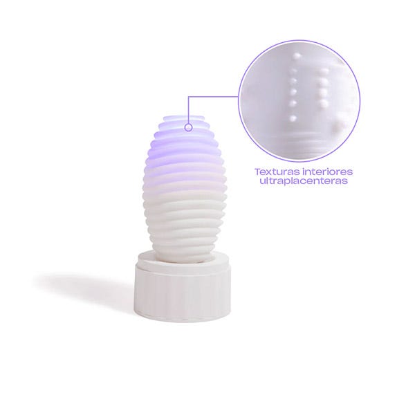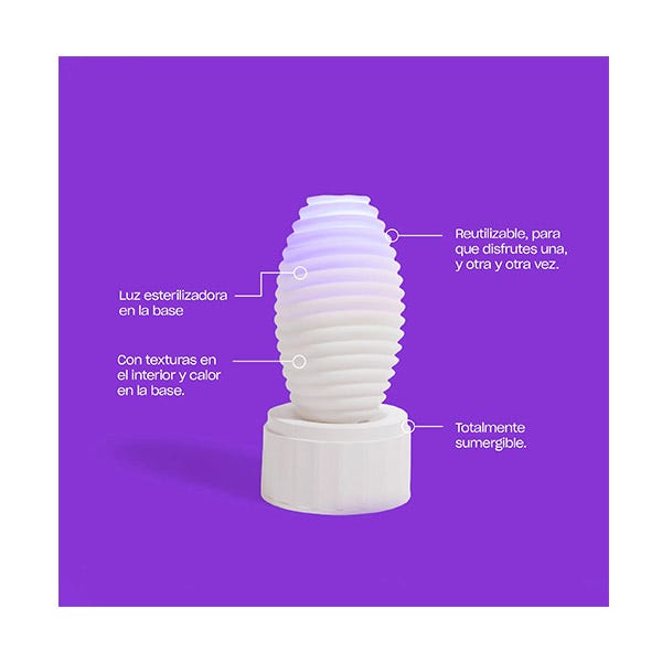 Una vez el juguete esté caliente y desinfectado, es hora de empezar a disfrutar (aunque también puedes utilizarlo directamente sin tener que calentarlo). Retíralo de la base y aplica un poco de lubricante en la entrada y el interior del juguete o en el pene directamente. A continuación, introduce tu pene y empieza a mover el masturbador de arriba abajo repetidamente para estimular el pene mediante la fricción generada por las texturas interiores.