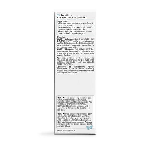 Acción antimanchas: Formulado con B-CORE 221™, actúa en los diferentes niveles del proceso de despigmentación para eliminar manchas existentes y prevenir su reaparición.