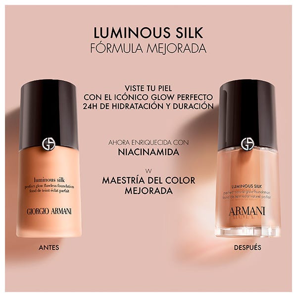 Descubre el secreto de una piel luminosa y perfecta con la renovada Luminous Silk Foundation de Armani Beauty. Esta icónica base de maquillaje líquida se reinventa con una fórmula mejorada que mantiene su acabado radiante y natural, ideal para todo tipo de pieles. Ahora enriquecida con una combinación de niacinamida, glicerina, lirio de mar y extracto de lupino blanco, ofrece hidratación prolongada y una sensación de confort durante todo el día.