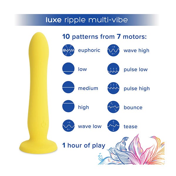 Luxe ripple multi-vibe nuestro primer dispositivo inspirado en un consolador. Este consolador con ventosa ayuda a satisfacer tus necesidades versátiles y exploratorias con o sin pareja. Con motores independientes, este dispositivo tiene 10 configuraciones de vibración diferentes en 7 puntos diferentes a lo largo de la forma para maximizar la experimentación. Este consolador con ventosa de tacto sedoso también es compatible con correas para un mejor juego en pareja. Descubre tu vibración y encuentra una satisfacción duradera.