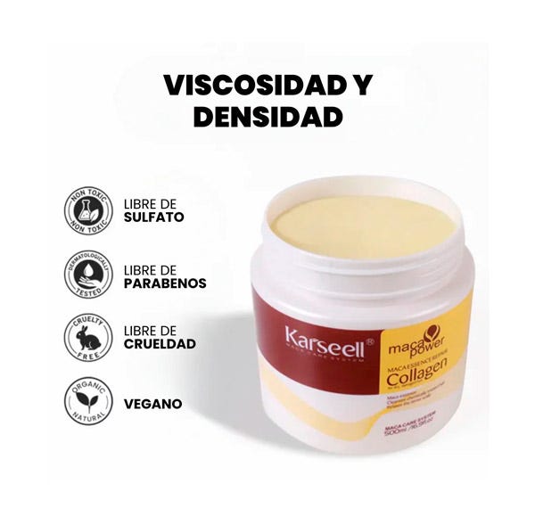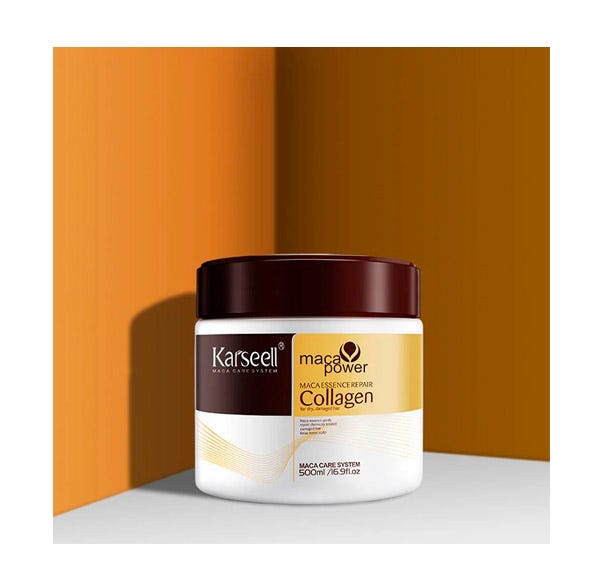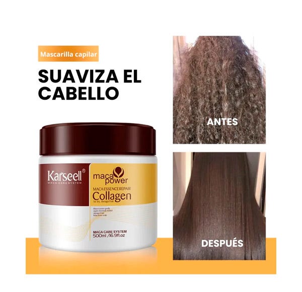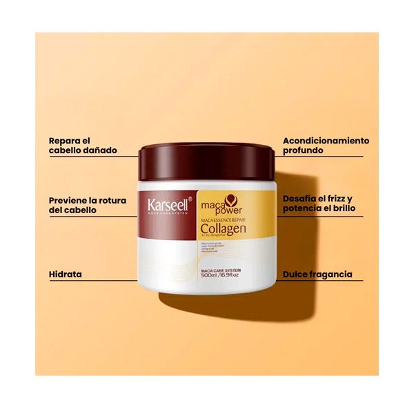 La Mascarilla capilar Karseell te deja el pelo suave, brillante y con un aroma que te transporta a un jardín de flores y frutas. Si tienes el pelo seco y/o dañado, ¡ no te preocupes ¡, nuestra mascarilla con colágeno activo es la solución. Contiene aceite de argán marroquí, muy conocido por sus propiedades nutritivas y reparadoras, y colágeno activo, el ingrediente estrella para una reparación profunda, además de esencia de maca y ácido hialurónico.