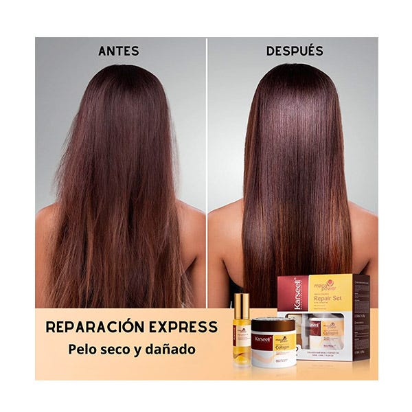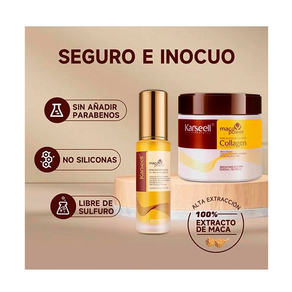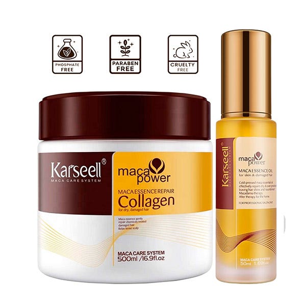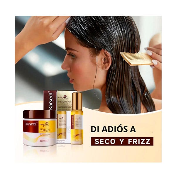 La Mascarilla y el Aceite capilar Karseell te deja el pelo suave, brillante y con un aroma que te transporta a un jardín de flores y frutas. Si tienes el pelo seco y/o dañado, Nuestra mascarilla con colágeno activo es la solución. Contiene aceite de argán marroquí, muy conocido por sus propiedades nutritivas y reparadoras, y colágeno activo, el ingrediente estrella para una reparación profunda, además de esencia de maca y ácido hialurónico.