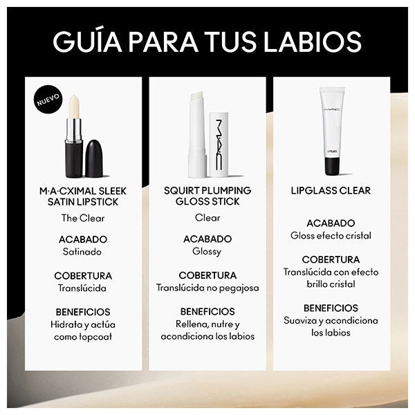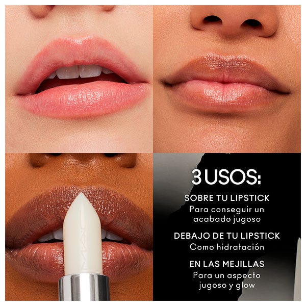 Unos labios siempre In The Clear con el nuevo M·A·CXimal Sleek Satin Lipstick. Un bálsamo que gracias a su acabado transparente y extra hidratante, se puede usar solo, como preparador de labios, sobre tu lipstick favorito, o como iluminador.