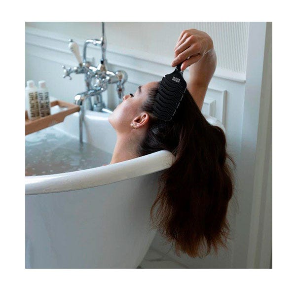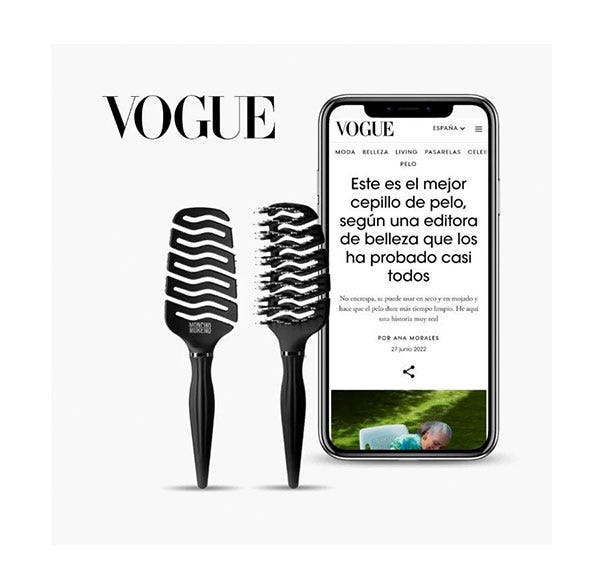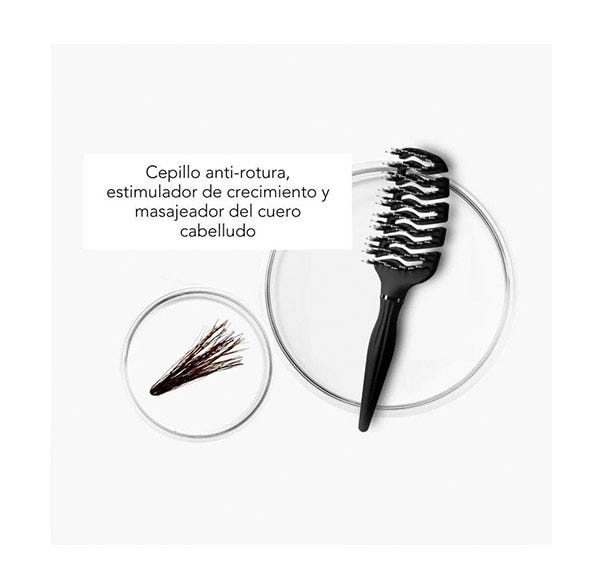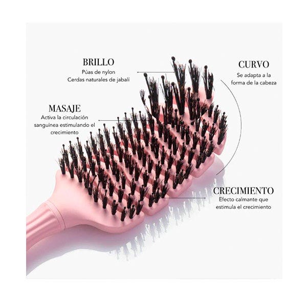 Cepillo Mágico - Cepillo de estructura curvada, flexible y ventilada diseñado según la forma de la cabeza para masajear el cuero cabelludo y activar la circulación sanguínea con una combinación perfecta de púas naturales de jabalí y púas sintéticas que evita roturas del cabello mientras desenreda sin dar tirones.