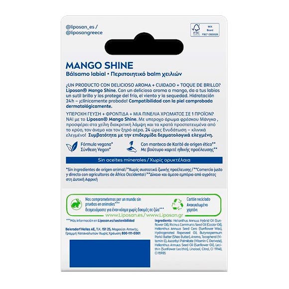 ¿UN PRODUCTO CON DELICIOSO AROMA + CUIDADO + TOQUE DE BRILLO? Liposan® Mango Shine. Con un delicioso aroma a mango, da a tus labios un sutil brillo y los protege del frío, el viento y la sequedad. Hidratación 24 h – ¡clínicamente probado! Compatibilidad con la piel comprobada dermatológicamente. Aplícalo regularmente para unos labios hidratados. No ingerir. Mantener en un lugar fresco y seco.