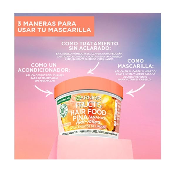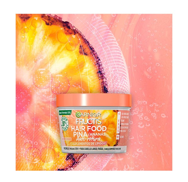 Descubre la nueva mascarilla 3 en 1 de Piña Garnier Fructis Hair Food, con fórmula vegana 97% natural y libre de siliconas que limpia y nutre el pelo largo y frágil sin apelmazar.
