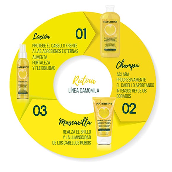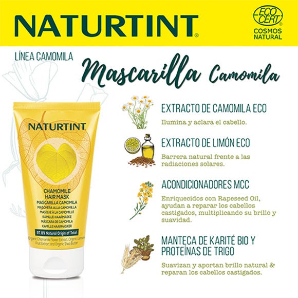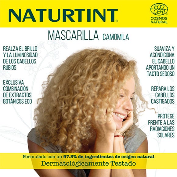- Extracto de Camomila BIO: rico en apigenina, pigmento natural amarillo, ilumina y aclara progresivamente el cabello.
