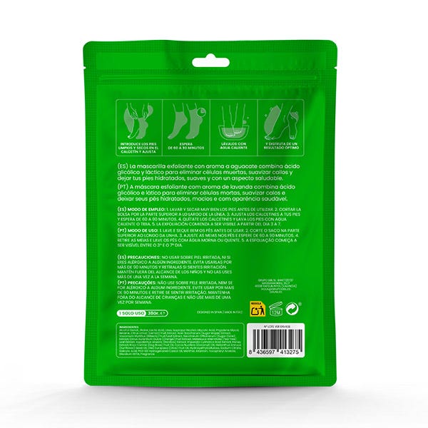 Esta mascarilla exfoliante con extracto de aguacate ayuda a retirar impurezas mientras deja la piel más suave, lisa y fresca gracias al ácido glicólico y al ácido láctico. Perfecta para pies resecos o con durezas.