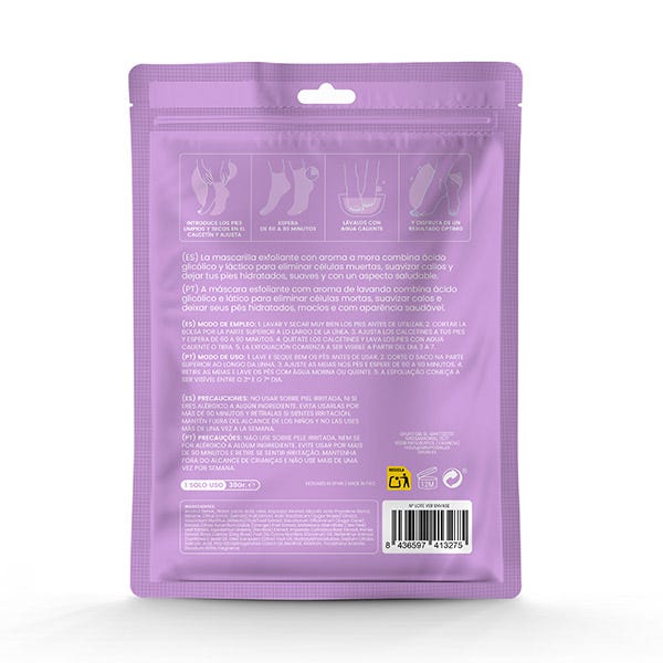 Rica en antioxidantes naturales, esta mascarilla de mora revitaliza mientras exfolia profundamente. Su fórmula con ácido glicólico y ácido láctico ayuda a regenerar la piel y a mejorar su textura, dejando los pies con un aroma frutal delicioso.