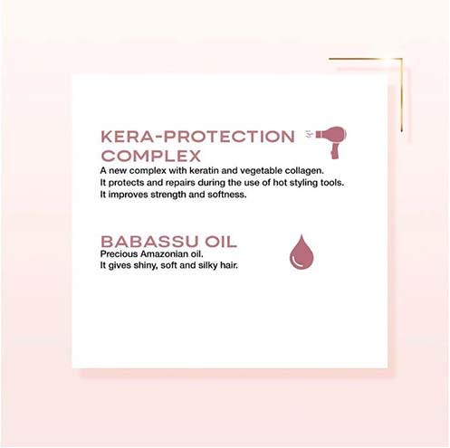 Protege y refuerza el cabello*, contrarrestando el natural proceso de resequedad del cabello y ayudando a mantener y prolongar en el tiempo los resultados cosméticos obtenidos con los tratamientos profesionales de alisado con queratina. Con Kera-protection complex y Aceite de Babasú para un cabello protegido, liso y hidratado.