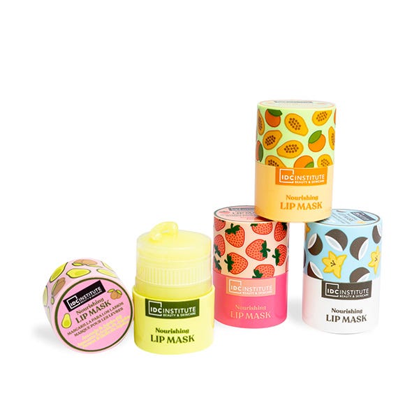 La Mascarilla Labial Skin Food de IDC Institute ofrece un tratamiento nutritivo para tus labios, disponible en cuatro sabores tentadores: Vainilla Coco, Aguacate y Aceite de Jojoba, Papaya y Mango, y Fresa.