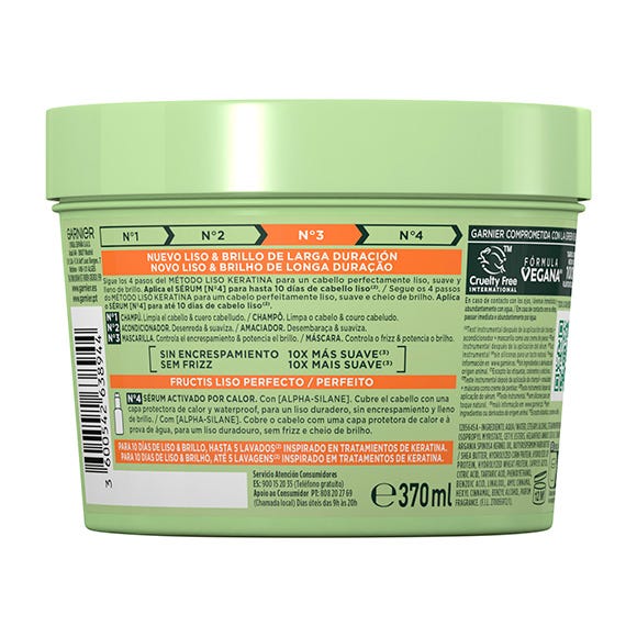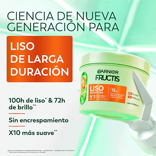 Consigue un pelo con brillo(1) y 4 días de liso(1). La mascarilla Liso Keratina controla el encrespamiento & potencia el brillo, sin siliconas(4) y con su fórmula vegana(6).