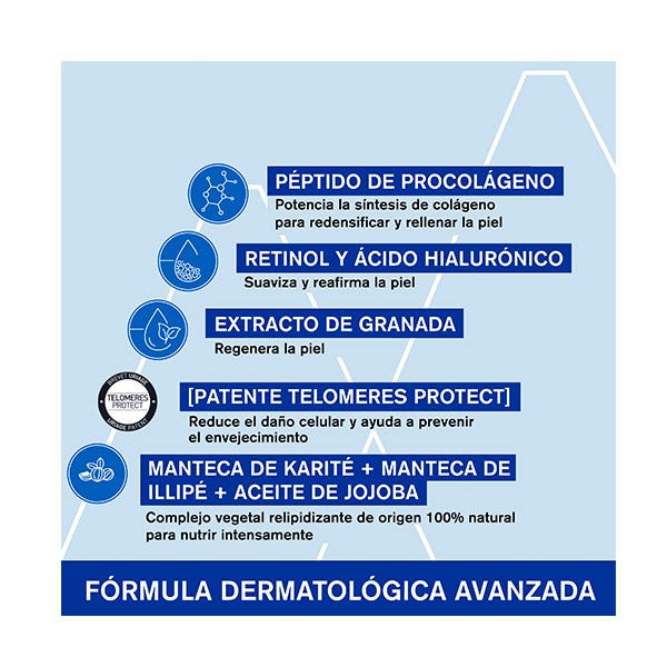 - Complejo patentado [TELOMERES PROTECT] que reduce el daño celular y ayuda a prevenir el fotoenvejecimiento causado por los rayos UV y la luz azul.