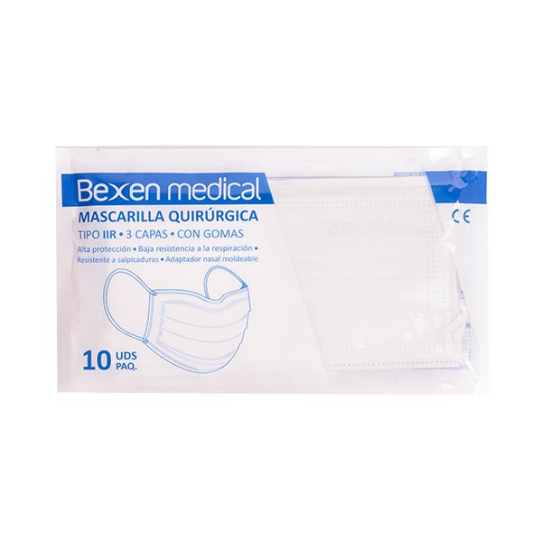 Mascarilla Quirúrgica Blanca desechable de 3 capas, tipo IIR (eficacia de filtración bacteriana (BFE) ≥ 98% y resistente a salpicaduras), plana, de color blanco, biocompatible, sin látex, con gomas de sujeción para las orejas y adaptador nasal.