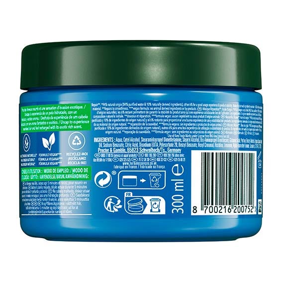 Herbal Essences Mascarilla Reparadora con Aceite de Argán ayuda a hidratar el pelo dañado, dejándolo suave y brillante. Te aportará vitalidad y frescor gracias a sus ricos y exóticos aromas. Al mezclar nutrientes de origen vegetal con el apreciado Aceite de Argán, obtenemos una fórmula vegana que hidrata el pelo frágil en profundidad. Repara de manera natural desde el primer uso. Utilizamos una cuidada selección de ingredientes de origen natural, lleva el poder de la naturaleza hasta tu baño