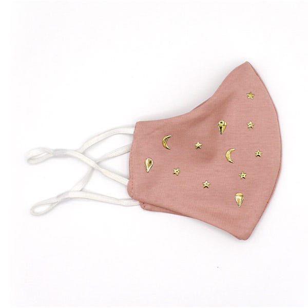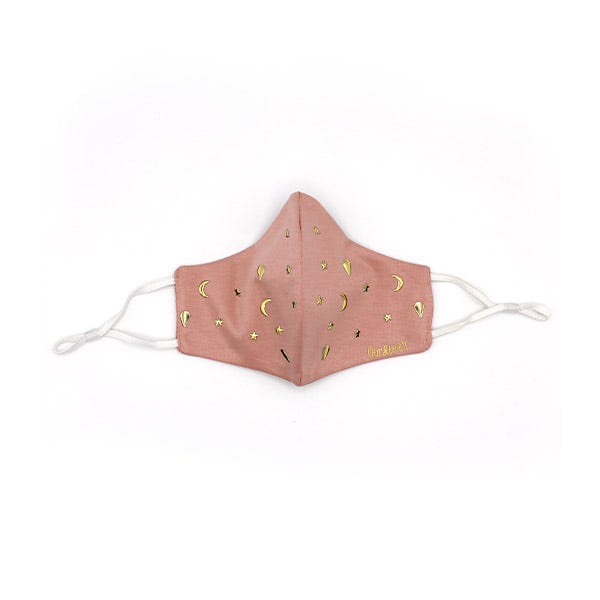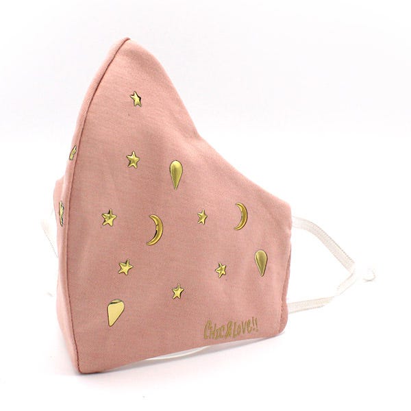 Mascarilla reutilizable rosa para niños de la marca Chic & Love con un mix de tachuelas metálicas con forma de estrellas, lunas y gotas.