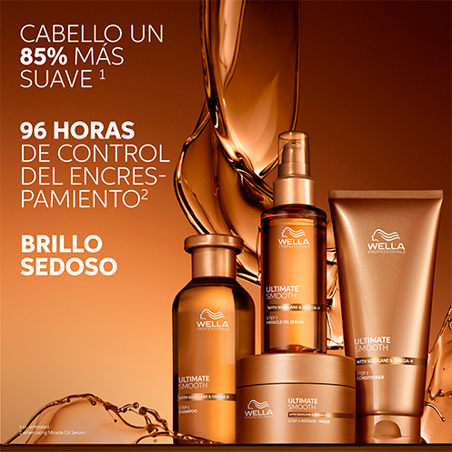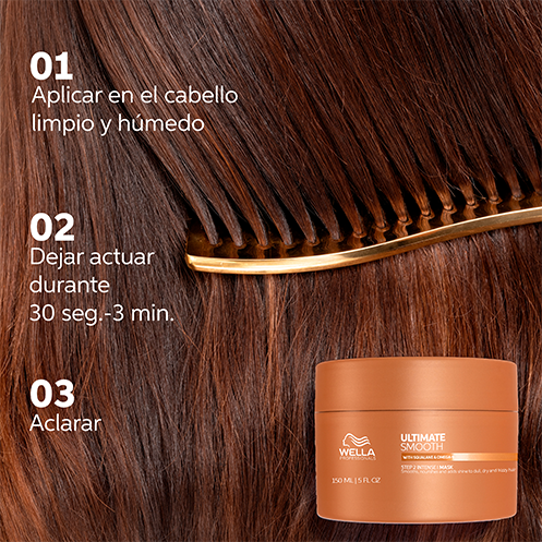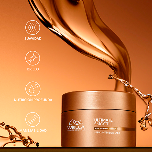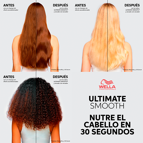 La mascarilla capilar Ultimate Smooth de Wella Professionals es parte de la rutina profesional de cuidado capilar, diseñada para proporcionar nutrición y suavidad al cabello seco, encrespado y sin brillo. La mascarilla Ultimate Smooth suaviza, nutre profundamente y proporciona brillo al cabello.