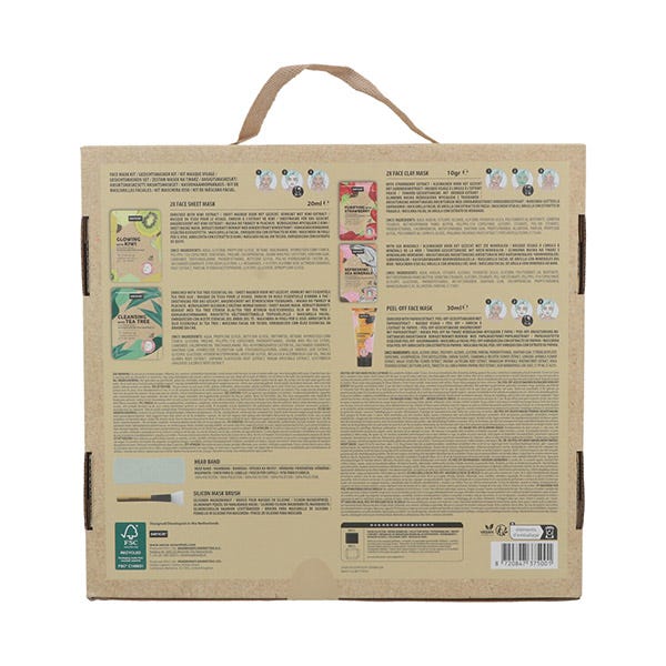 Contiene una diadema, un cepillo para mascarilla, dos mascarillas faciales, una mascarilla Peel-Off y dos mascarillas de arcilla para purificar tus poros y darle un plus de hidratación a tu rostro.