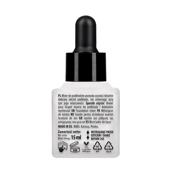 Dependiendo del efecto deseado, añada unas gotas del mezclador a la base de maquillaje y mezcle bien.