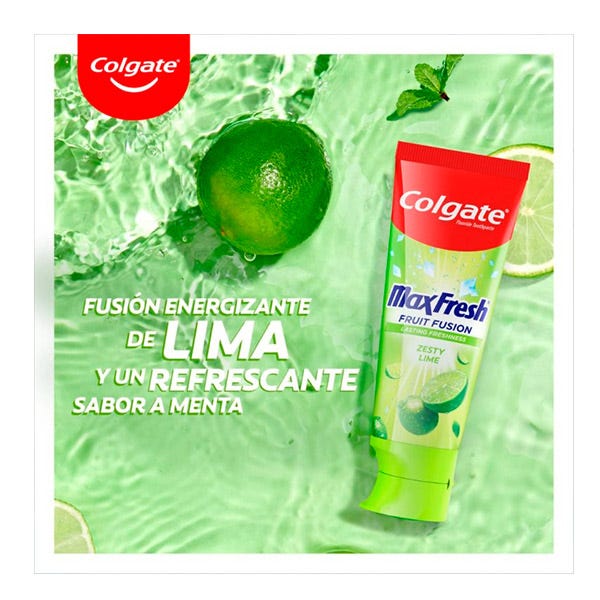 Despierta tus sentidos disfrutando de una energizante fusión de frutas cada vez que te cepilles los dientes con la pasta de dientes Colgate Max Fresh Fruit Fusion con sabor Lima. Esta pasta de dientes afrutada proporciona los sensacionales sabores cítricos del limón, la lima y la naranja, a la vez que ofrece un aliento fresco 10X más duradero*.