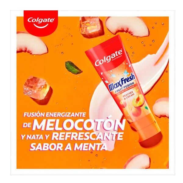 Despierta tus sentidos disfrutando con una energizante fusión de frutas cada vez que te cepilles los dientes con la pasta de dientes Colgate Max Fresh Fruit Fusion sabor Melocotón y Nata. Esta pasta de dientes de frutas proporciona una sensacional combinación de sabores a melocotón y nata y ofrece un aliento fresco 10X más duradero*.