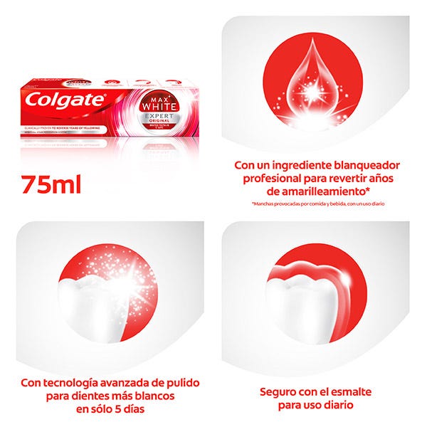 Colgate Max White Expert White Original es una pasta de dientes blanqueadora con flúor para uso diario y sabor mejorado. Contiene un ingrediente blanqueador profesional, clínicamente probado para revertir años de amarilleamiento (Manchas provocadas por comida y bebida, con un uso diario). Con Colgate Max White Expert White consigue unos dientes más blancos en 5 días con tecnología avanzada de pulido. Este dentífrico Colgate Max White Expert es seguro para el esmalte de sus dientes.
