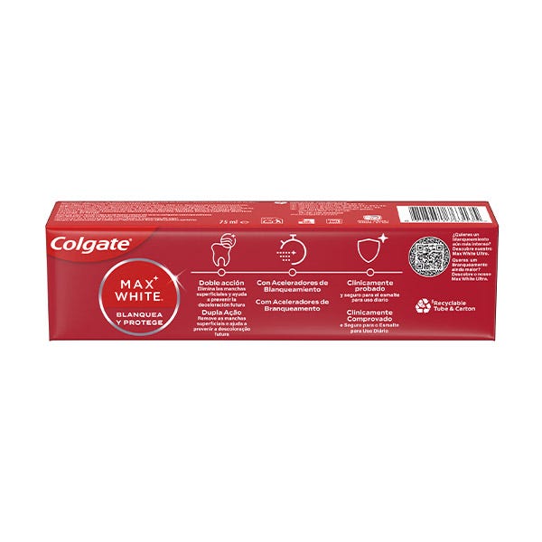 Colgate Max White One es una pasta de dientes blanqueadora con flúor para conseguir un tono más blanco en una semana. Está clínicamente probado que elimina hasta el 100% de las manchas superficiales.