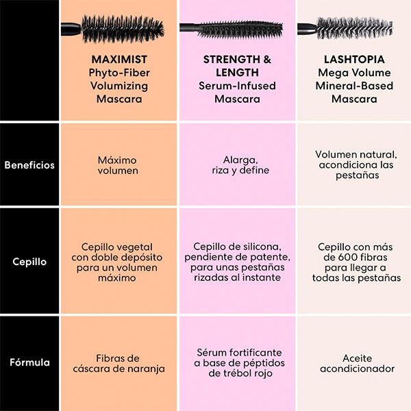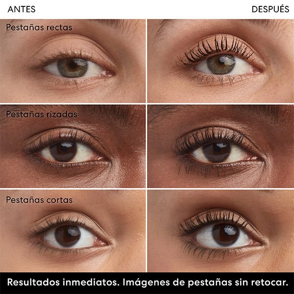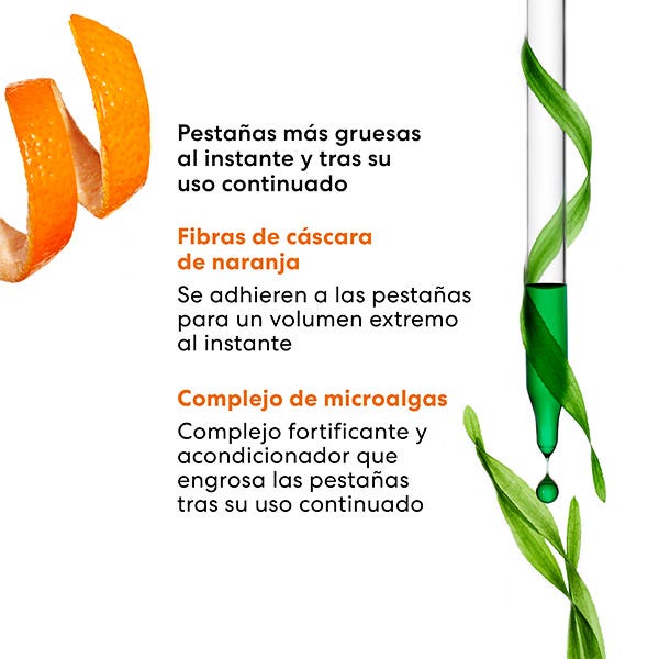 • Con fibras de cáscara de naranja recicladas que se adhieren a las pestañas para conseguir un volumen instantáneo
