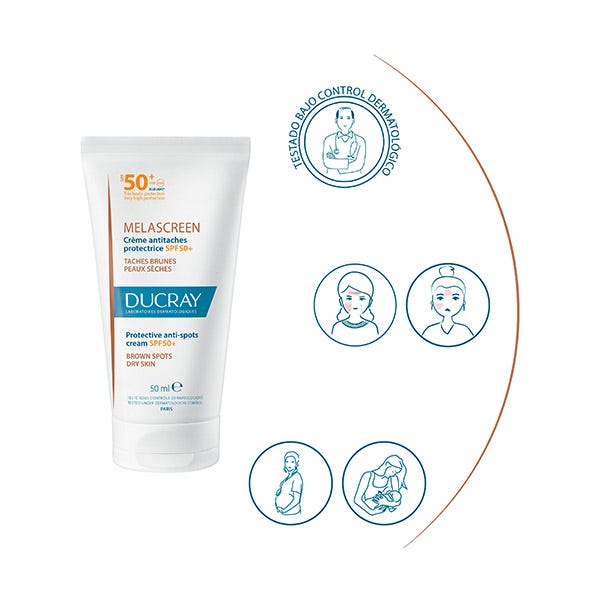 MELASCREEN Crema protectora antimanchas SPF50+ es la primera crema antiimperfecciones de uso diario con una protección muy alta que previene y reduce la aparición de manchas marrones, a la vez que protege la piel contra los rayos UVB, los rayos UVA cortos y largos, la luz azul y los efectos nocivos de la contaminación.