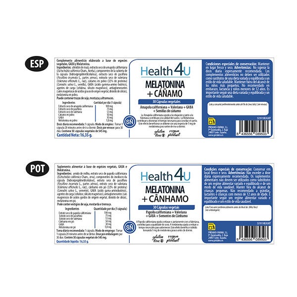 Almidón de maíz, extracto seco de amapola californiana (Eschscholzia californica Cham., hierba), componentes de la cubierta de la cápsula (hidroxipropilmetilcelulosa), extracto seco de pasiora (Passiora incarnata L., partes aéreas), extracto seco de valeriana (Valeriana ocinalis L., raíz), cáñamo en polvo (32% de proteína) (Cannabis sativa L., semilla), GABA (ácido gamma-amino butírico), agentes de carga (celulosa, silicato magnésico), antiaglomerantes (sales magnésicas de ácidos grasos de origen vegetal, dióxido de silicio), melatonina en polvo. Puede contener trazas de soja, mostaza y altramuces.