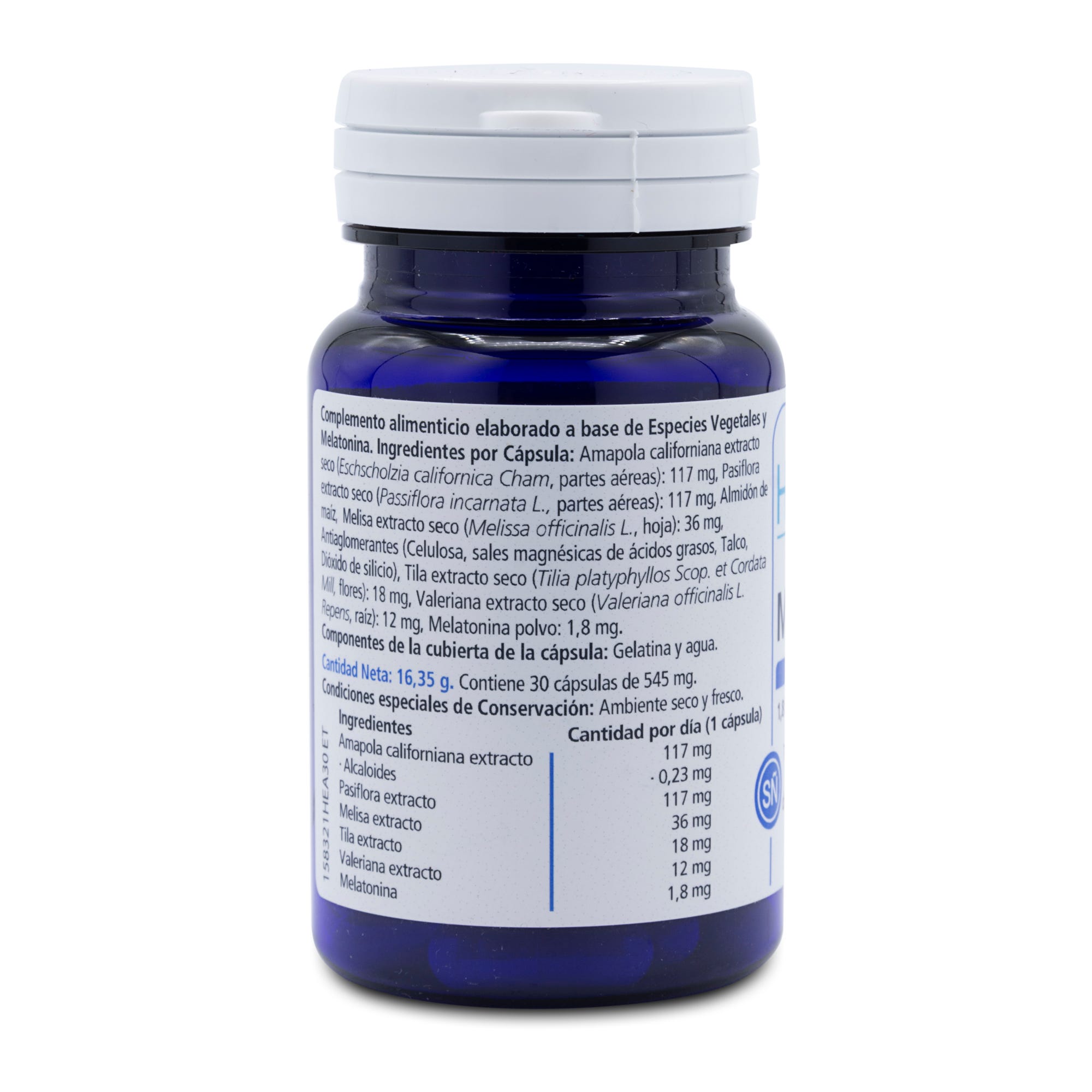 Ingredientes por cápsula:   Amapola californiana extracto seco (Echscholzia californica Cham, partes aéreas): 117 mg , Pasiflora extracto seco (Passiflora incarnata L, partes aéreas): 117 mg, Almidón de maíz, Melisa extracto seco (Melissa officinalis L, hoja): 36 mg, Antiaglomerantes (Celulosa, sales magnésicas de ácidos grasos, Talco, Dióxido de silicio), Tila extracto seco (Tilia platyphyllos Scop. et Cordata Mill, flores): 18 mg, Valeriana extracto seco (Valeriana officinalis L Repens, raíz): 12 mg, Melatonina polvo : 1,8 mg.
