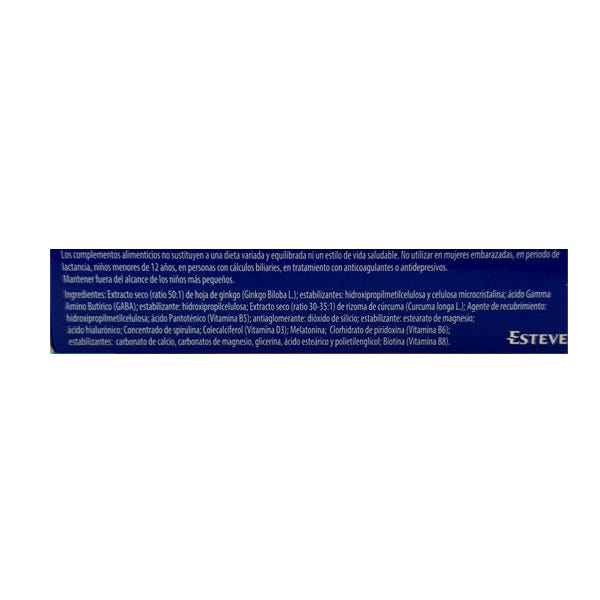 Extracto seco (ratio 50CL) de hoja de ginkgo (Ginkgo Biloba L); estabilizantes; hidroxipropilmetilcelulosa y celulosa microcristalina, ácido Gamma (GABA); estabilizante  hidroxipropilmetilcelulosa; extracto seco (ratio 30.35:1) de rizoma de cúrcuma. Agente de recubrimiento: hidroxipropilmetilcelulosa, ácido pantoténico ( vitamina B5); anti aglomerante: dióxido de silicio, estabilizantes, estearato de magnesio; ácido hialurónico; Concentrado de espirulina; colecalciferol (Vitamina D3); Melatonina; clorhidrato de piridoxina (vitamina B6); estabilizantes; carbonato de calcio, carbonatos de magnesio, glicerina, ácido esteárico y polietilenglicol, Biotina ( Vitamina B8)